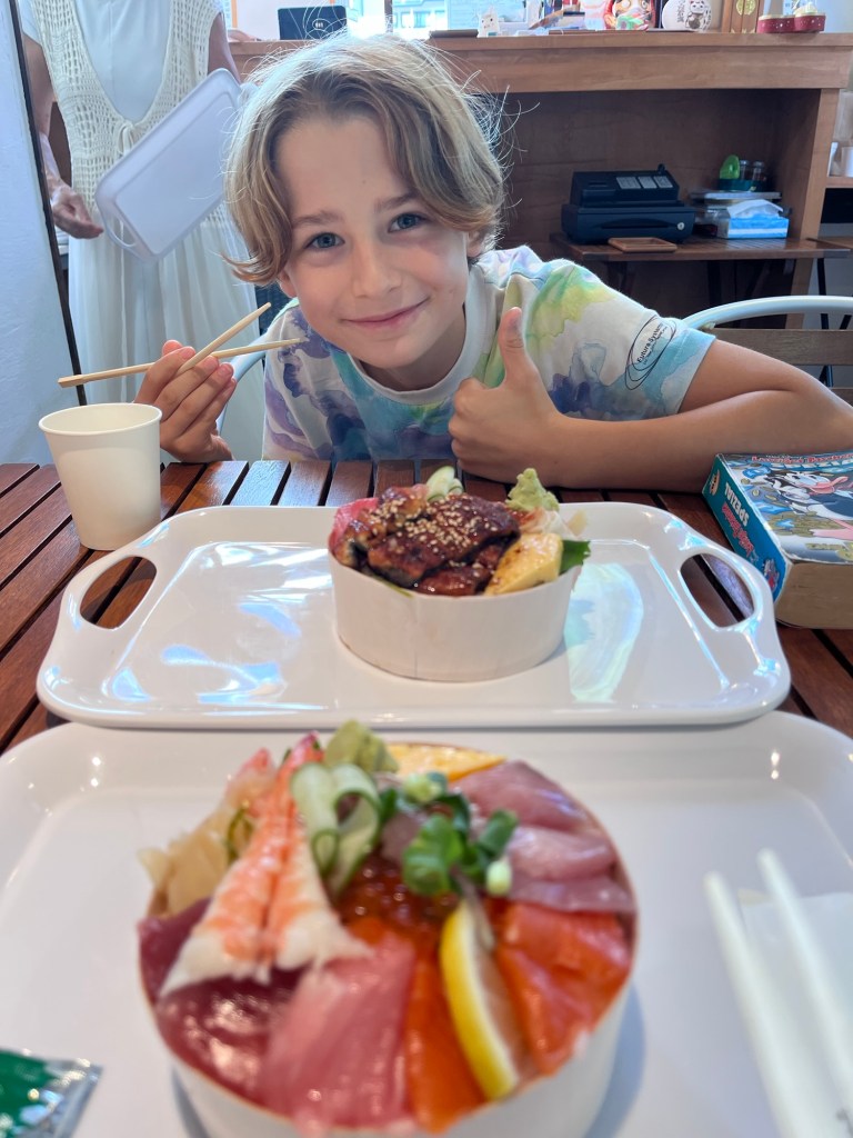 Wir sind mit vielen verschiedenen Verkehrsmitteln gereist. Zuerst mit dem Bus dann mit der Seilbahn und mit dem Schiff zum Mittagessen gab es eine Sushi Poké Bowl.