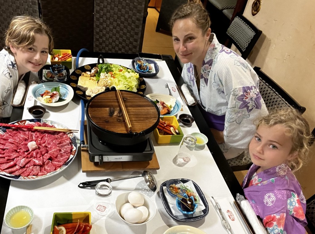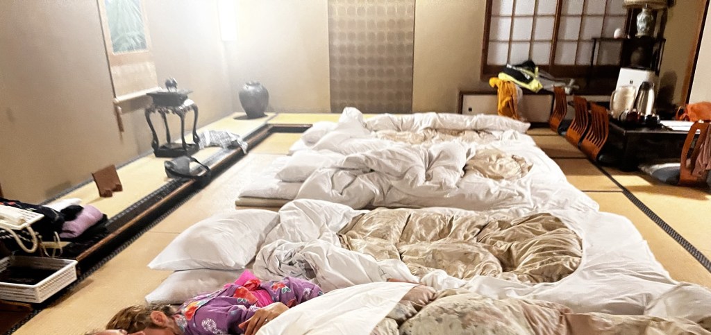 Der Tag begann damit, dass wir jede zweite Abbiegung falsch abgebogen sind, weil die dummen Touristen (wir) das Verkehrsnetz einfach nicht verstehen. Dann kamen wir aber im Riokan an. Das ist ein traditionelles, japanisches Hotel. Leider heisst japanisches traditionelles Hotel auch Tatami Matten. Jeder, der bis jetzt mein Blog gelesen hat weiss wie ich zu Tatami Matten stehe. Im Hotel und aussen rum gibt es viele Onsen. Das sind sehr sehr heisse, natürliche Quellbäder. Im Onsen gab es zwei Personen, die uns besonders auffielen: ich und mein Vater nannten sie Wombat und King Onsen. Wombat fühlte sich im Onsen, den wir viel zu heiss fanden, so wohl wie ein Schwein im Schlamm und King Onsen lies sich auch schön kochen.